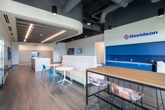 A New Facility for Davidson Technologies, the 45,434 square foot office building is located at Redstone Gateway in Huntsville, Alabama. The building consists of private offices, open offices, conference rooms, a large multipurpose room for training which can hold up to 150 people, break areas, a fitness room, and secure spaces. A unique design feature is the acoustic ceiling features in the break room as well as in the large multipurpose room. We developed a close working relationship with our client to ensure their immediate needs were met such as fitting in each department independently of each other. Together we enabled Davidson to be able to grow into a new focused and collaborative series of spaces while being conscientious of their budget.
