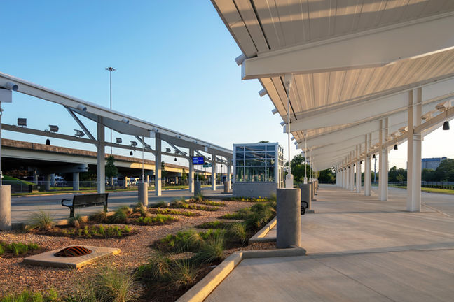 The transit station's grand entry tower serves as a visual landmark, symbolizing the city's commitment to modern transit solutions. The canopy, spanning the full 450 feet of the bus platform, is inspired by the wings of a bird, ready for flight. Below the canopy, a thoughtfully designed rain garden integrates nature with industrial form, enhancing both aesthetics and functionality. The main building is constructed using dark brick veneer and ground-face block, while the canopy and roof structure utilize white-coated steel, merging durability with clean, modern lines.